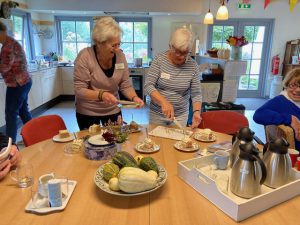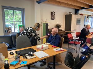 Iedereen genoot van een heerlijk stukje taart, de accordeonisten speelden gezellige muziek en Xandra heeft tijdens de live-uitzending gesproken met de voorzitter en onze oudste deelnemer. Het lang zal ze leven werd volop meegezongen, kortom een leuk feestje!