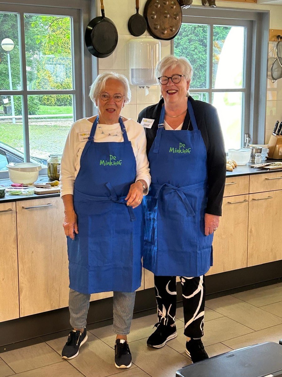 Twee koks van de kookgroep showen hun nieuwe schort, die ’s ochtens op het jubileum werd aangeboden.