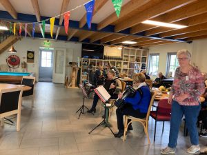 Iedereen genoot van een heerlijk stukje taart, de accordeonisten speelden gezellige muziek en Xandra heeft tijdens de live-uitzending gesproken met de voorzitter en onze oudste deelnemer. Het lang zal ze leven werd volop meegezongen, kortom een leuk feestje!