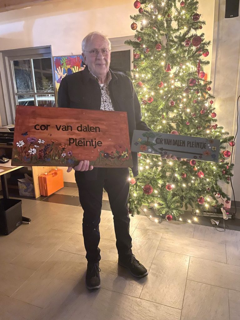 Bert, de vicevoorzitter van het bestuur, hield vervolgens een lovende toespraak waarin hij een aantal zaken benoemde die Cor voor de Minkhof heeft bereikt. O.a. veel sponsorgeld binnen gehaald en de Fruitgaard. Als dank krijgt Cor 2 prachtige borden, door Doortje gemaakt, met zijn naam erop. We krijgen het Cor van Dalenpleintje in de Fruitgaard. Cor krijgt een bedrag ter beschikking om zijn pleintje mooi in te richten. Cor heeft ook nog een fotoboek ontvangen met veel mooie foto’s van zijn tijd als voorzitter bij de Minkhof.