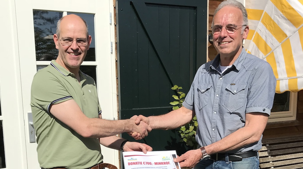 WiecherinkFred Wissing, eigenaar van Wiecherink Bouwmaterialen uit Gendt, is tevreden als hij na een rondleiding op De Minkhof een cheque ter waarde van zevenhonderd euro overhandigt aan Jan Rossen. Zo’n mooi initiatief wil hij graag ondersteunen.